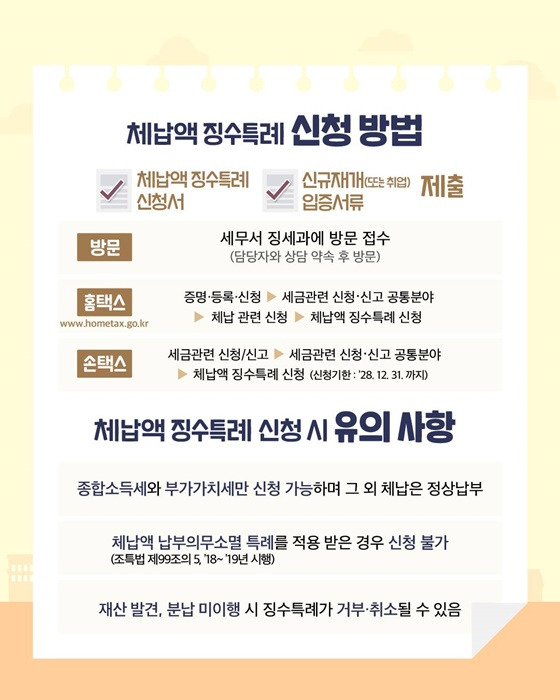 체납액 징수특례제도는 어려운 시기를 겪고 계신 영세 개인사업자분들이 세금 부담 없이 다시 일어설 수 있도록 도와주는 제도예요.